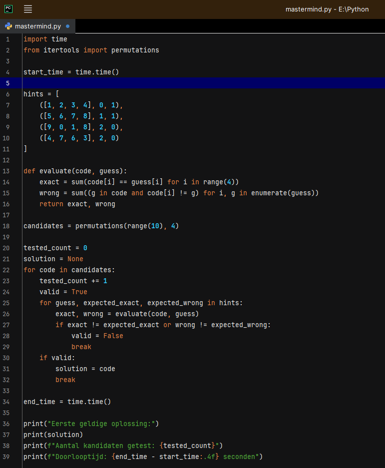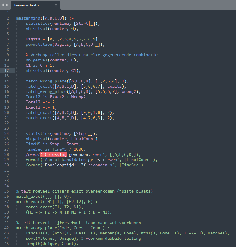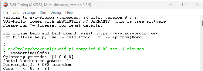 Ook dit is met Prolog goed te doen, echter regel 7 geeft het al aan ‘permutation’… dat betekent dat Prolog hier alle combinaties genereert en check welke aan alle regels voldoet. Dat noem ik dus brute force…. en het kost 8 seconden. Dat gaat aanzienlijk vlotter in Python!