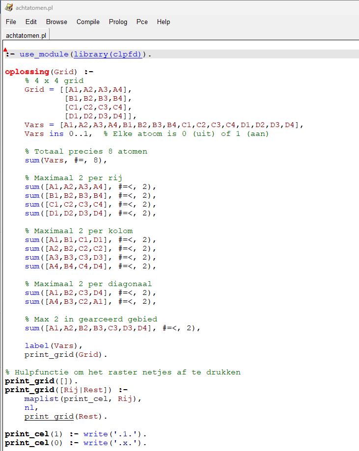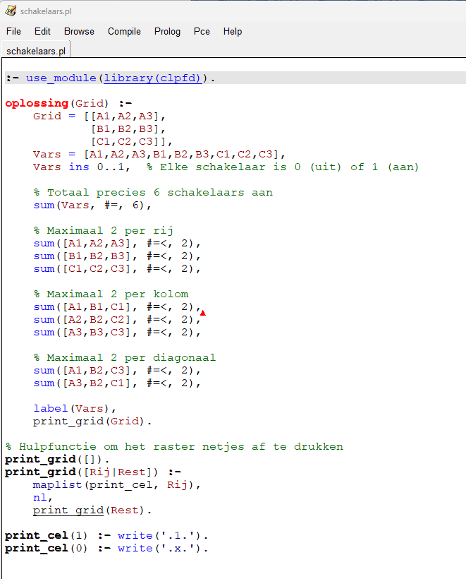 Nee, dan is Prolog hier toch wel heel charmant. Het bovenstaande vertaal je in 9 regels en je vraagt Prolog simpelweg om een oplossing die daaraan voldoet. https://www.swi-prolog.org/