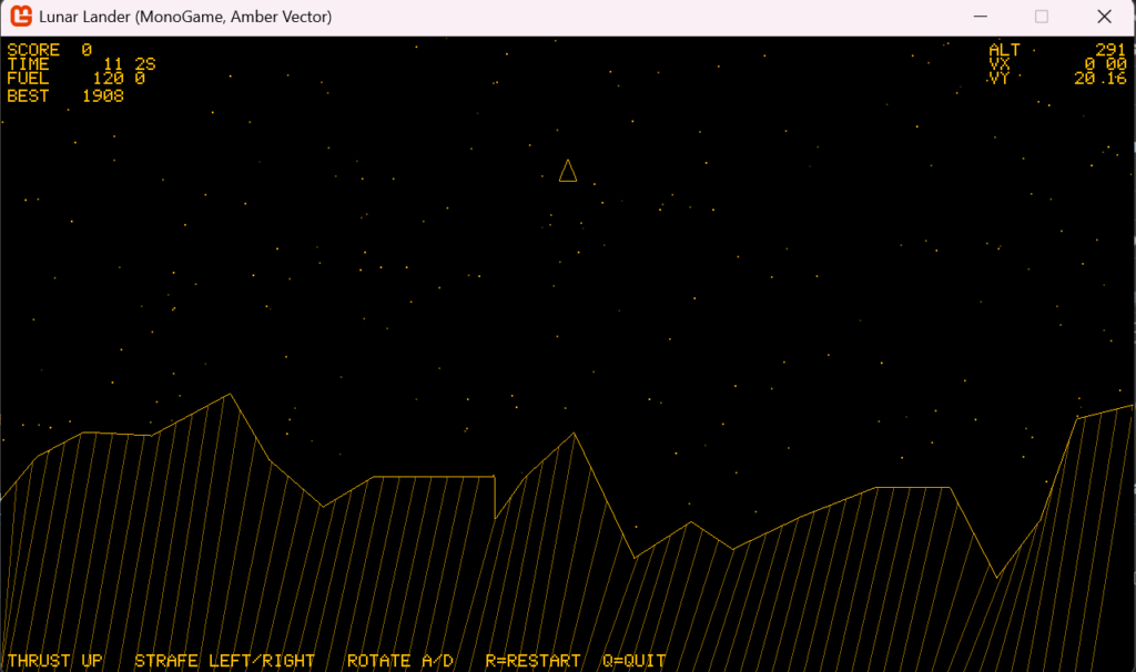 Mijn C# versie is gemaakt als Visual Studio Monogame project. Mijn PC had een ‘amber’ scherm (*veel* mooier dan groen) dus vandaar de kleur.
